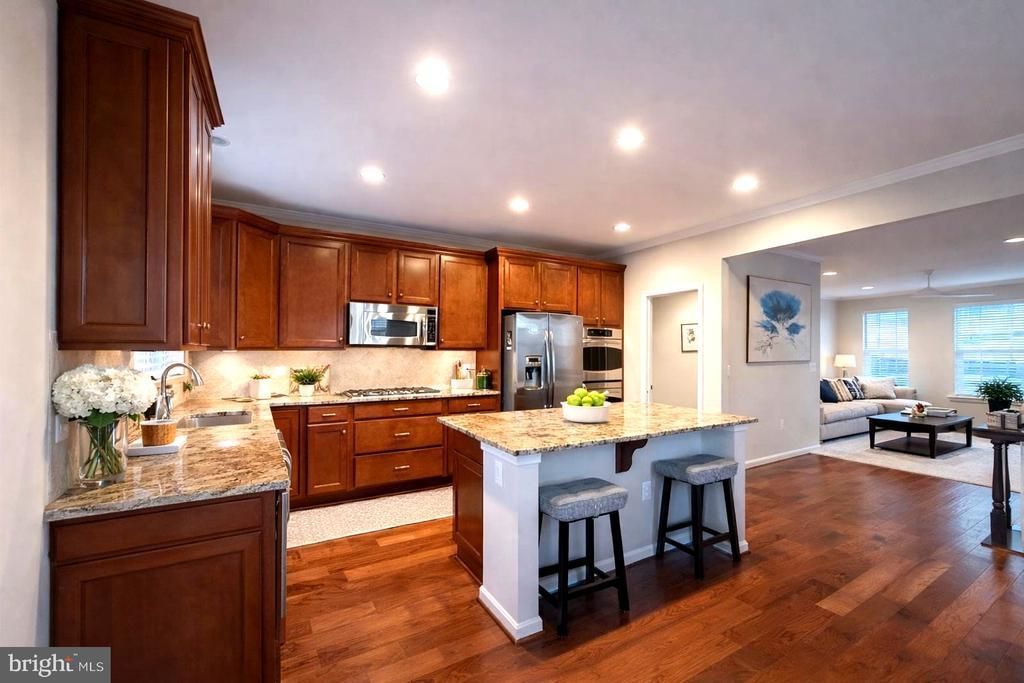 Beautifully maintained end-unit townhome in the desirable EastGate Square community, located on one of the neighborhood’s premium lots with scenic views. This home offers nearly 2,600 sq ft of living space with abundant natural light from windows on three sides. The main level features hardwood floors, a gas fireplace with surround sound, and a gourmet kitchen with granite countertops, oversized island, GE Profile appliances, double wall ovens, custom backsplash, and walk-in pantry. A spacious terrace off the kitchen is perfect for outdoor entertaining. Upstairs includes a private primary suite with spa bath and walk-in closet, two additional bedrooms, a full bath, and convenient bedroom-level laundry. The lower level offers a rec room and a fourth bedroom with ensuite bath. Additional upgrades include Ring doorbell, Nest thermostat, new washer/dryer, new dishwasher, and upgraded roof. Convenient to Routes 50, 28, Loudoun County Parkway, Dulles Airport, Wegmans, Harris Teeter, and dining.